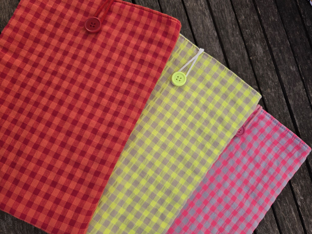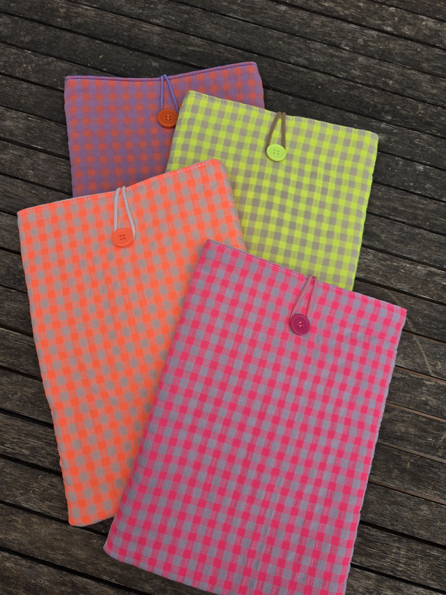 Funda de libro acolchada vichy rosa flúor, realizada con tela 100% algodón exterior e interior. Rellena de guata de algodón para darle cuerpo y no abultar demasiado.