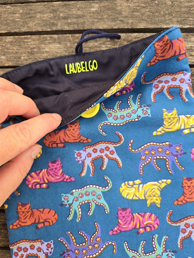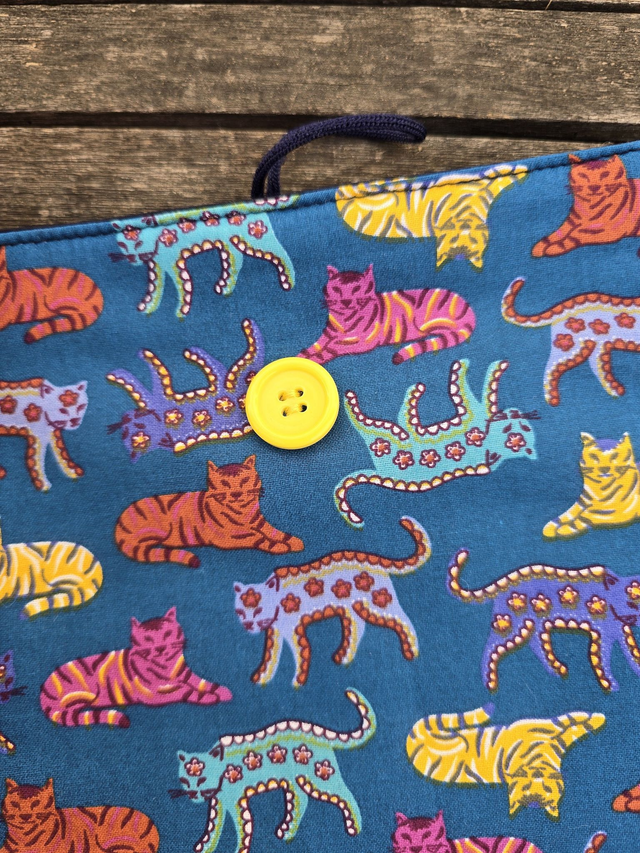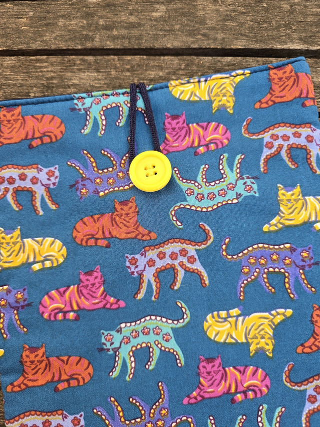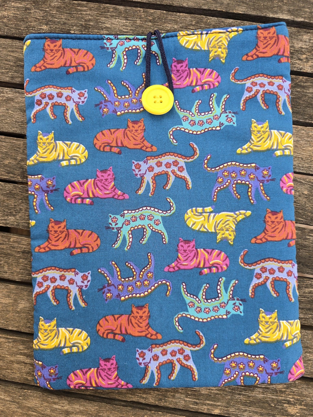 Funda de libro acolchada de gatos, realizada con tela 100% algodón exterior e interior. Rellena de guata de algodón para darle cuerpo y no abultar demasiado.