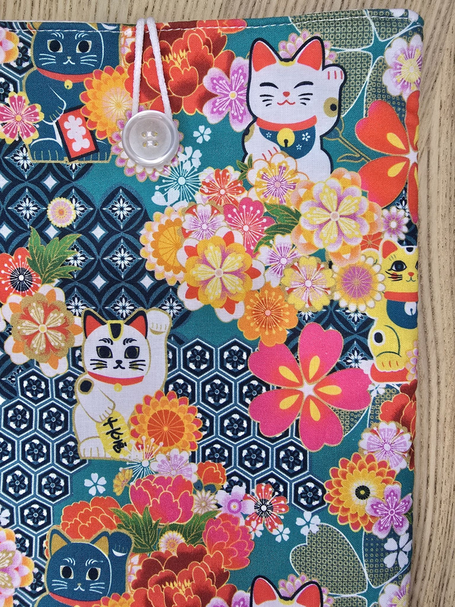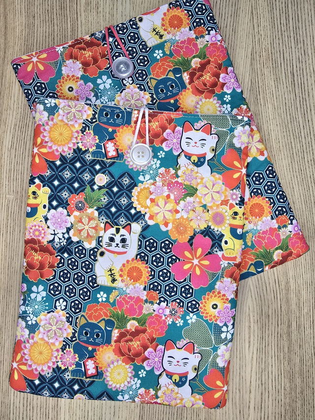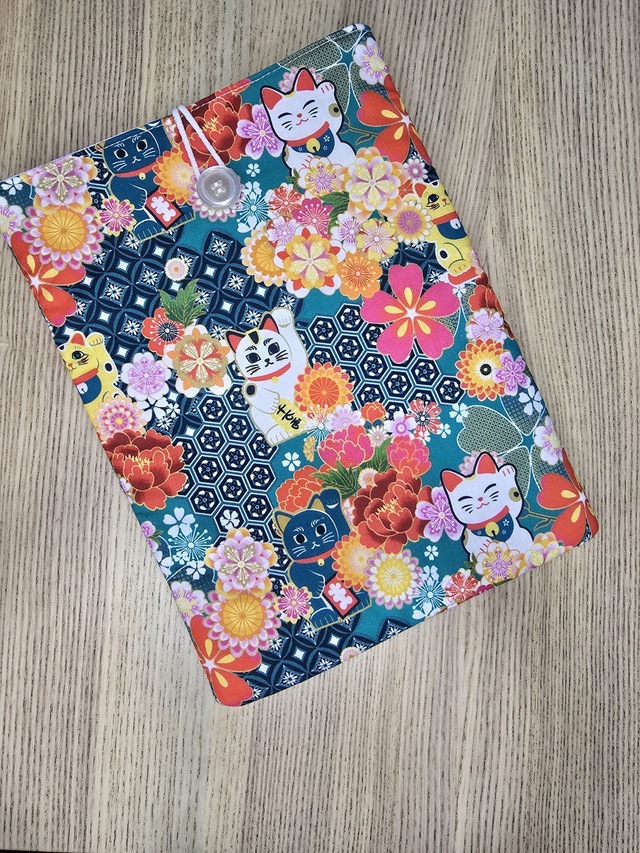Funda de libro acolchada de gatos, realizada con tela 100% algodón exterior e interior. Rellena de guata de algodón para darle cuerpo y no abultar demasiado.