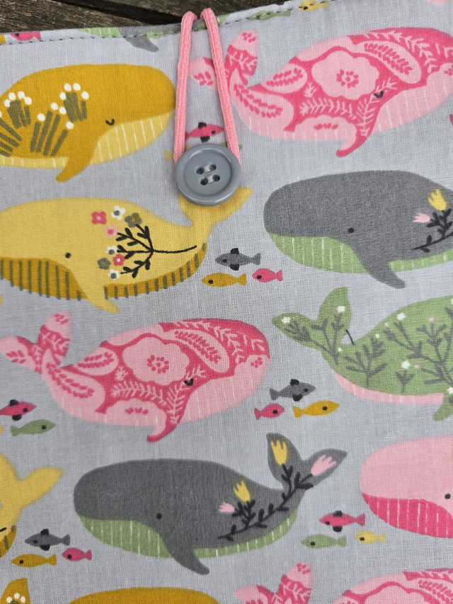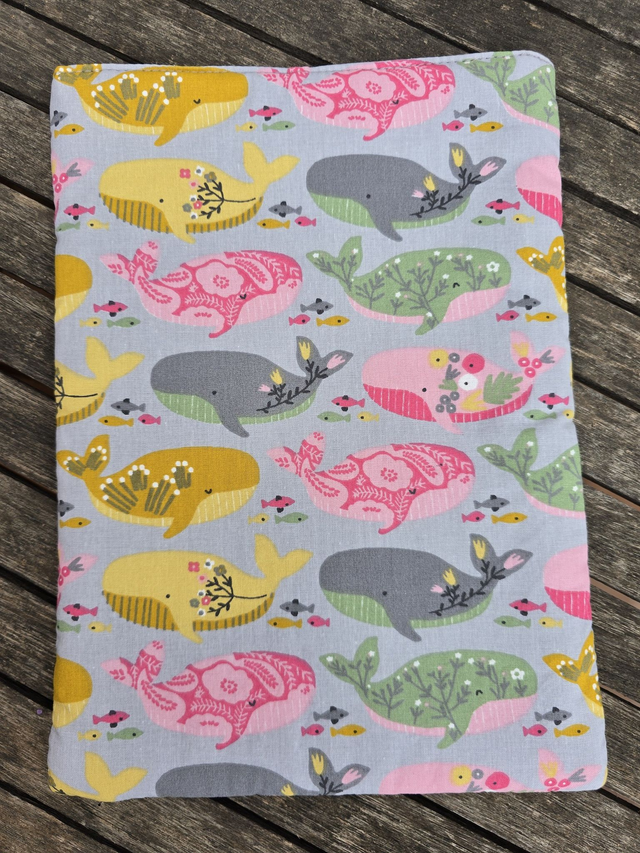 Funda de libro acolchado de ballenas de colores, realizada con tela 100% algodón exterior e interior. Rellena de guata de algodón para darle cuerpo y no abultar demasiado.